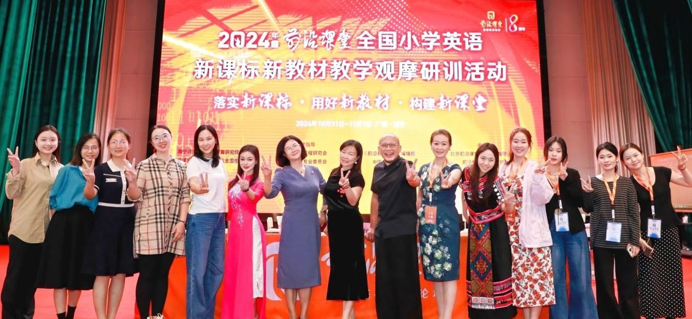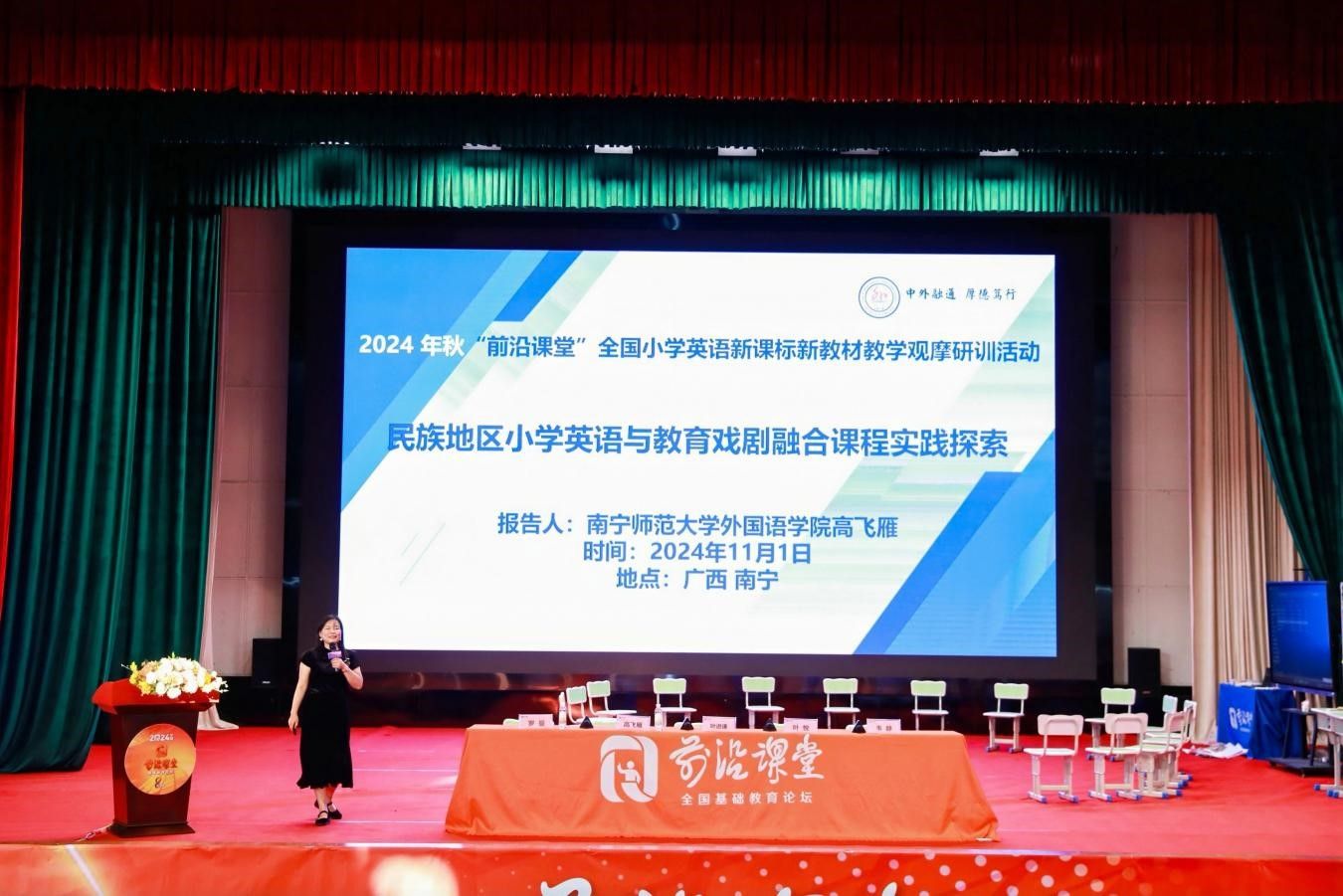 2024年10月31日-11月1日,2024年秋“前沿课堂”全国小学英语新课标新教材教学观摩研训活动在广西南宁圆满召开。williamhill中国官方网站威廉希尔中文官网副经理高飞雁带领学院教育戏剧团队作为本次大会特邀嘉宾,与来自全国各地的名师专家、优秀教师代表汇聚一堂,共同参与这场精彩的新教材研讨活动。