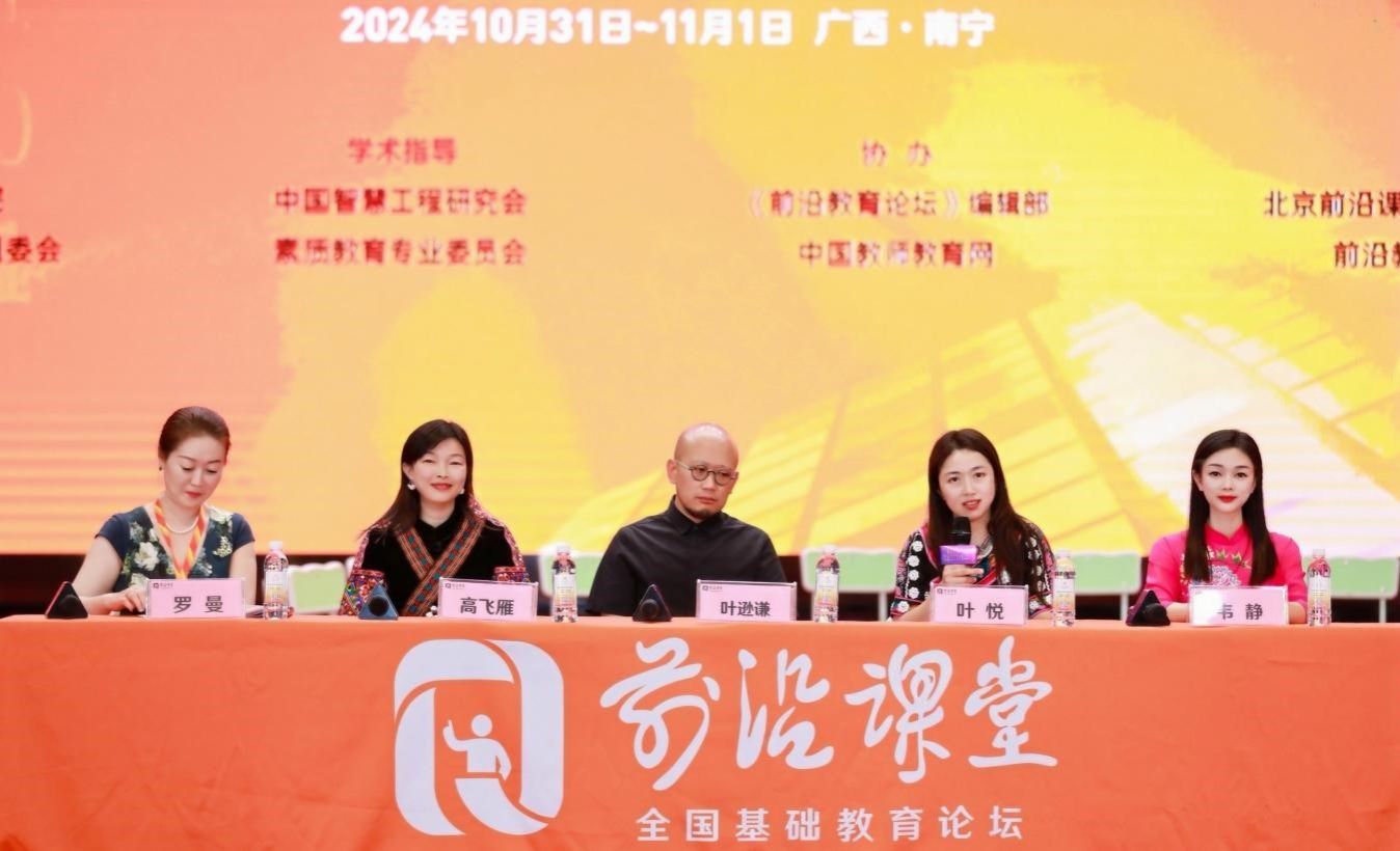 课后,威廉希尔中文官网教育戏剧团队高飞雁、叶悦、基地学校南宁市华衡小学科研主任韦静老师以及喜马拉雅教育戏剧研究院经理、中国戏剧文学学会戏剧教育专业委员会主任委员、导演、戏剧教育专家叶逊谦老师共同参与了“前沿课堂”基础教育论坛主席、前沿教育科学研究院经理罗曼主持问课评课、专题指导活动,解答现场观众提出的问题。