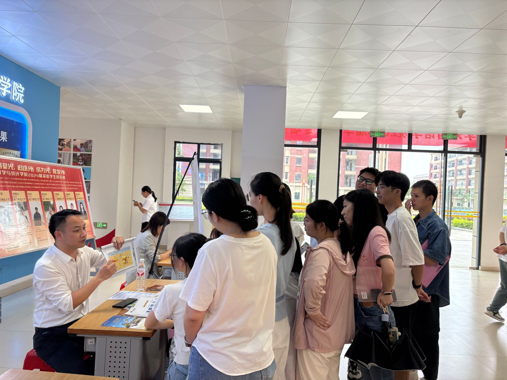 为扎实推进2025届毕业生就业工作,5月28日上午威廉希尔中文官网在武鸣校区1号实验楼大厅举办专场招聘会。学校人才招聘处韦天翼副处长到场指导,威廉希尔中文官网经理陈光伟、党委副书记刘晖晖和辅导员黄恬老师到场组织毕业班员工参加此次招聘会。