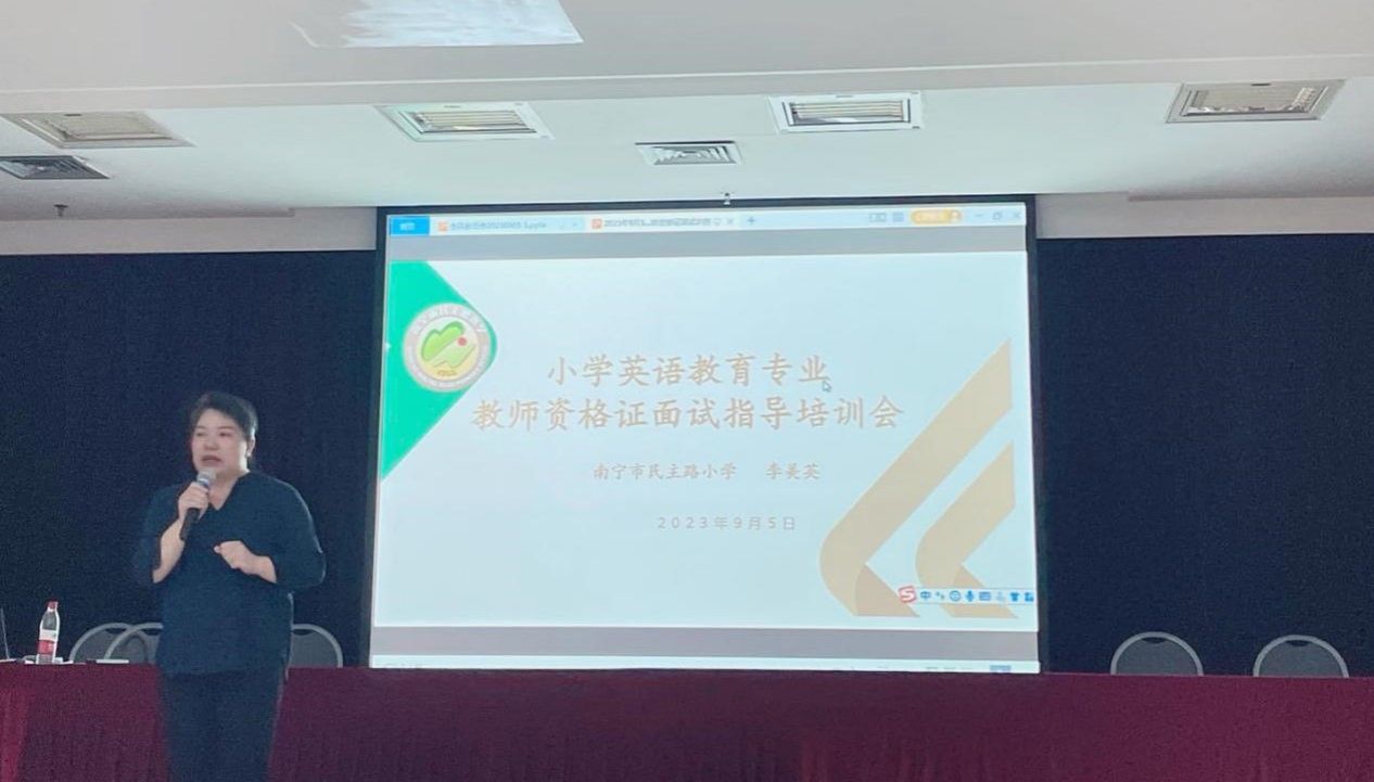 为帮助同学们积极应对教团队格证考试,增强就业竞争力,9月5日晚七点半,公司在建政校区教育大厦18楼报告厅为2021级小学英语教育专业员工举办教团队格证面试指导培训会。学院邀请了南宁市民主路小学英语学科带头人李美英老师为同学们进行专业指导。学院副经理高飞雁、辅导员、毕业班班主任、2021级普专全体在校生参加本次培训会。