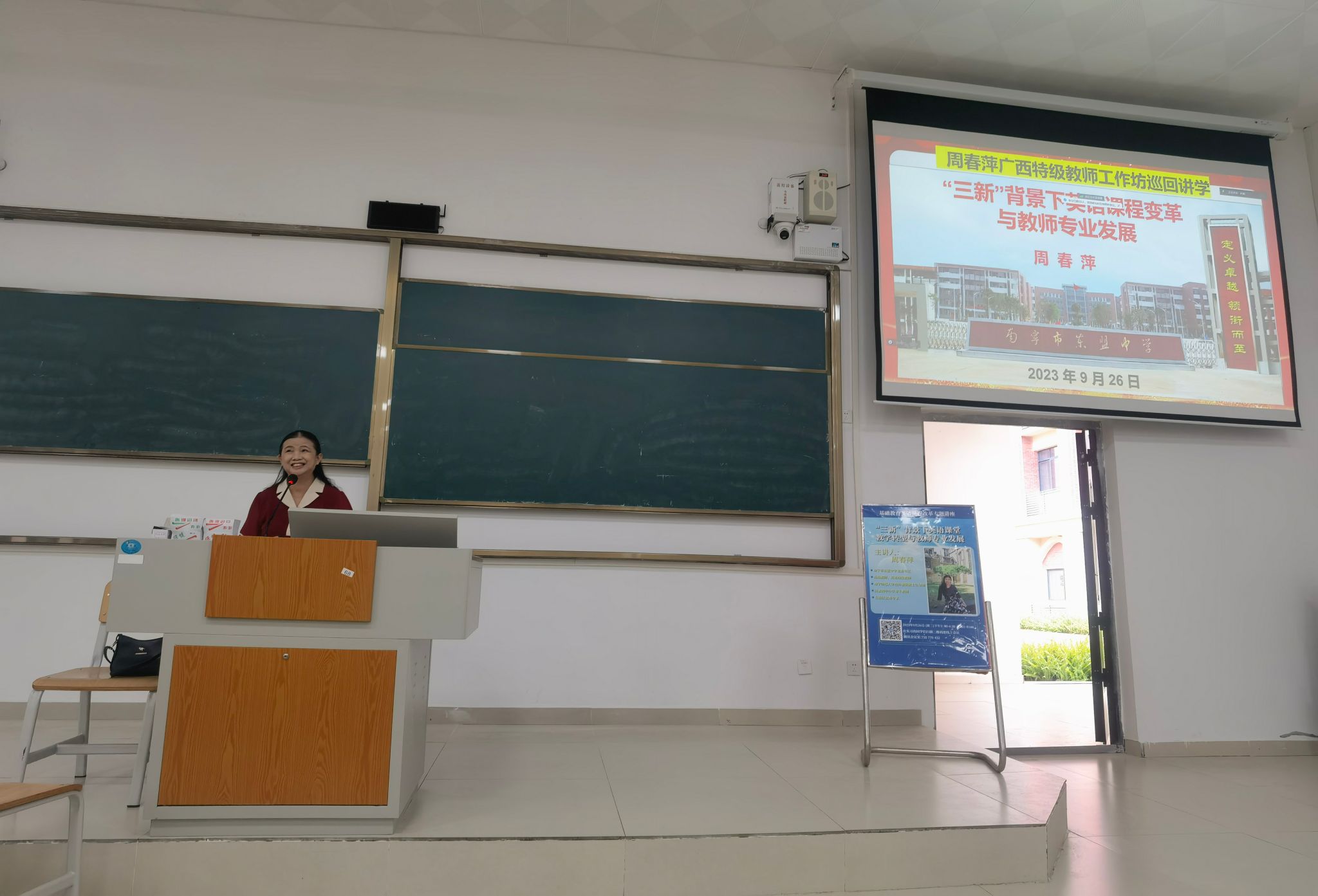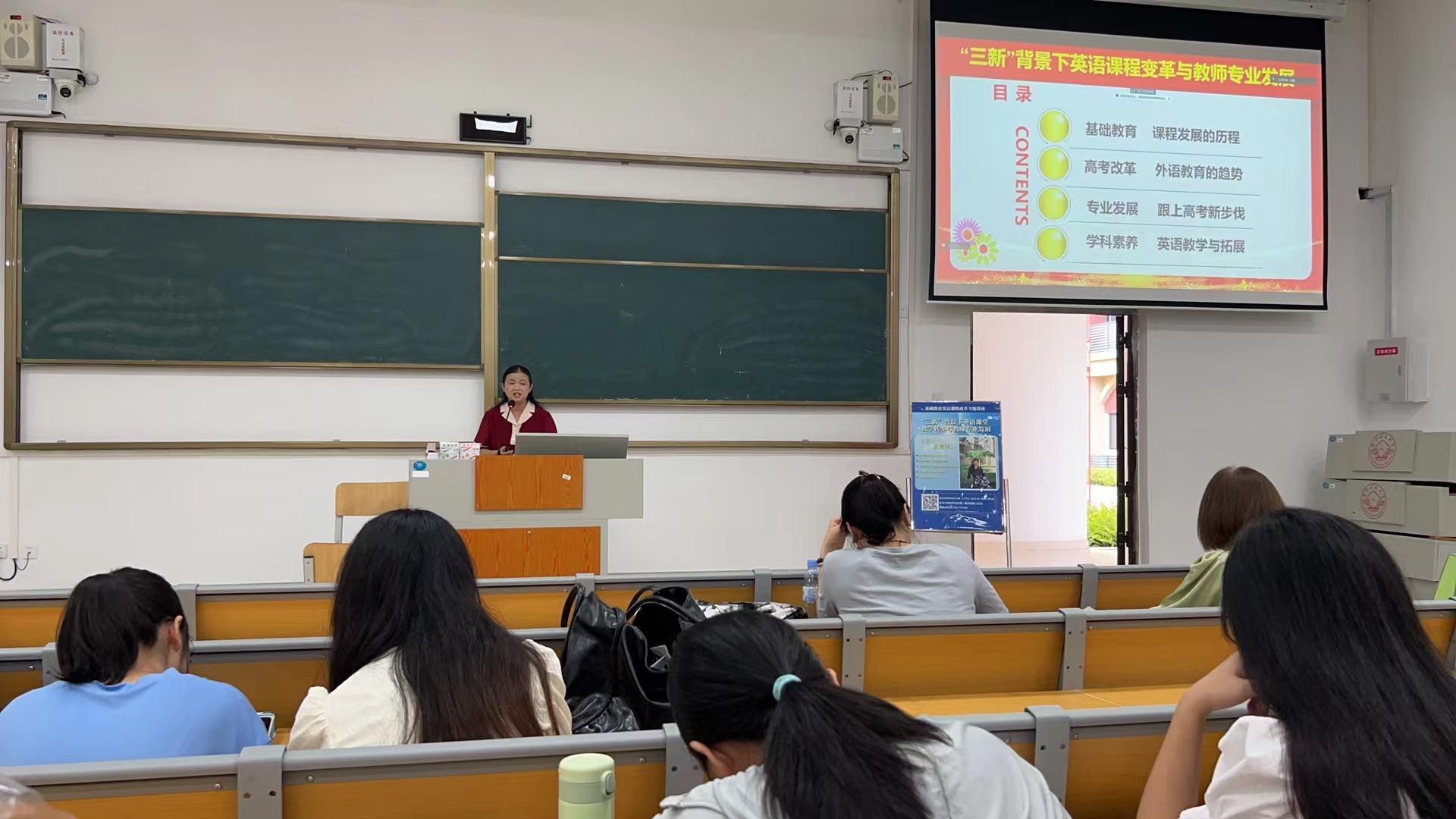 为促进英语专业师范生核心素养的养成,2023年9月26日下午,南宁市东盟中学党委书记、英语特级教师周春萍老师为英语专业师范生做题为《 “三新”背景下英语课程变革与教师专业发展》的专题讲座。本次讲座是英语专业《基础教育英语课程改革》系列专题之一,讲座由蒙岚副经理主持,邓芳娇老师、林绍丽老师以及2022级学科教学(英语)专业、2020级英语专业1-5班和陶行知实验班全体员工参加了此次讲座。