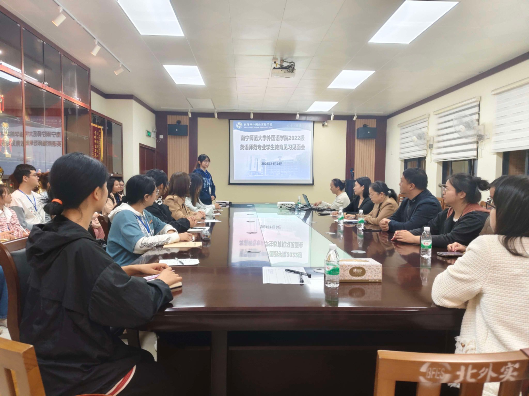 会议伊始,周光辉副董事长对北海外国语实验学校进行了简短的介绍,涵盖了学校的历史、办学理念、教学设施及团队力量等方面内容,让见习生们初步了解学校情况。随后,李艳玲副董事长宣布了见习分组情况及指导老师名单,详细说明了每组见习生的指导老师及见习班级,确保见习生们能够得到充分的指导和帮助。指导老师代表张颖老师也进行了发言,她表示将全力以赴地指导见习生们进行教学实践,并希望见习生们能够珍惜这次机会,虚心学习,不断进步。