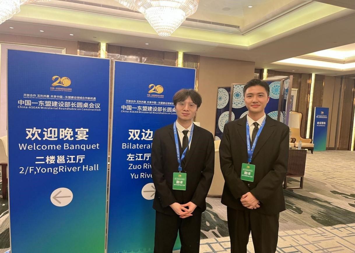 侯艺东老师承担会议招待晚宴的交传工作,同时为中国—东盟建筑业合作与发展成果展提供同传服务,有效助力中国与东盟各国住建部领导和嘉宾的深入交流。公司研究生尚武卉、朱晓淑、胡宇珩、宁雨茜、侯思梦、黄雪分别担任马来西亚代表团、文莱代表团、东盟秘书处随团翻译、媒体区采访翻译及晚宴交传等工作。本次翻译服务得到与会中外领导和嘉宾的一致好评,展示了公司助力“一带一路”建设和地区发展的语言服务能力。