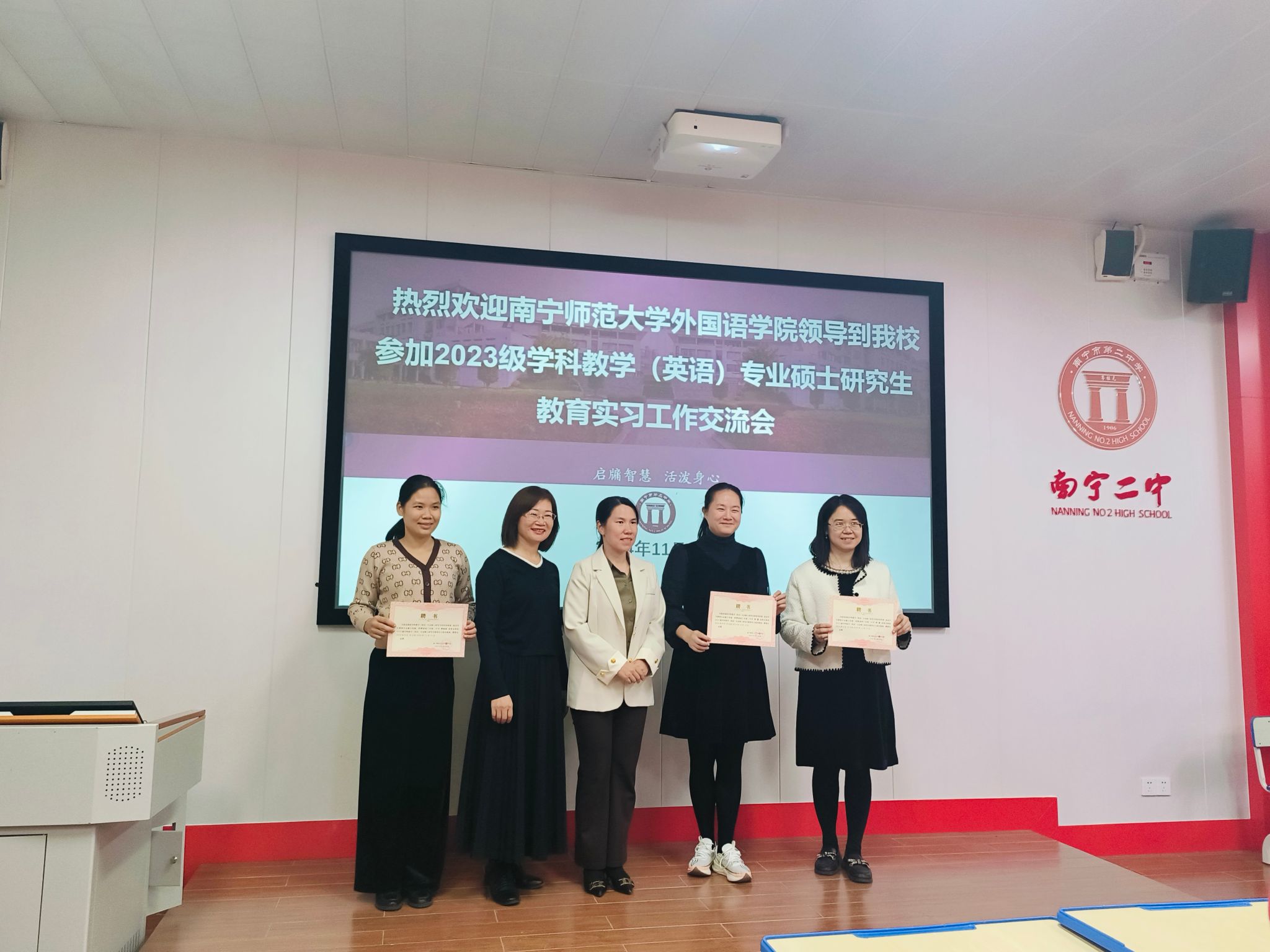 11月22日下午,威廉希尔中文官网副经理蒙岚老师、邓芳娇老师前往南宁市第二中学(初中部)了解公司学科教学(英语)专业硕士研究生教育实习情况。此行不仅是一次实习情况的检查,更是一场教育经验与理念的深度交流。