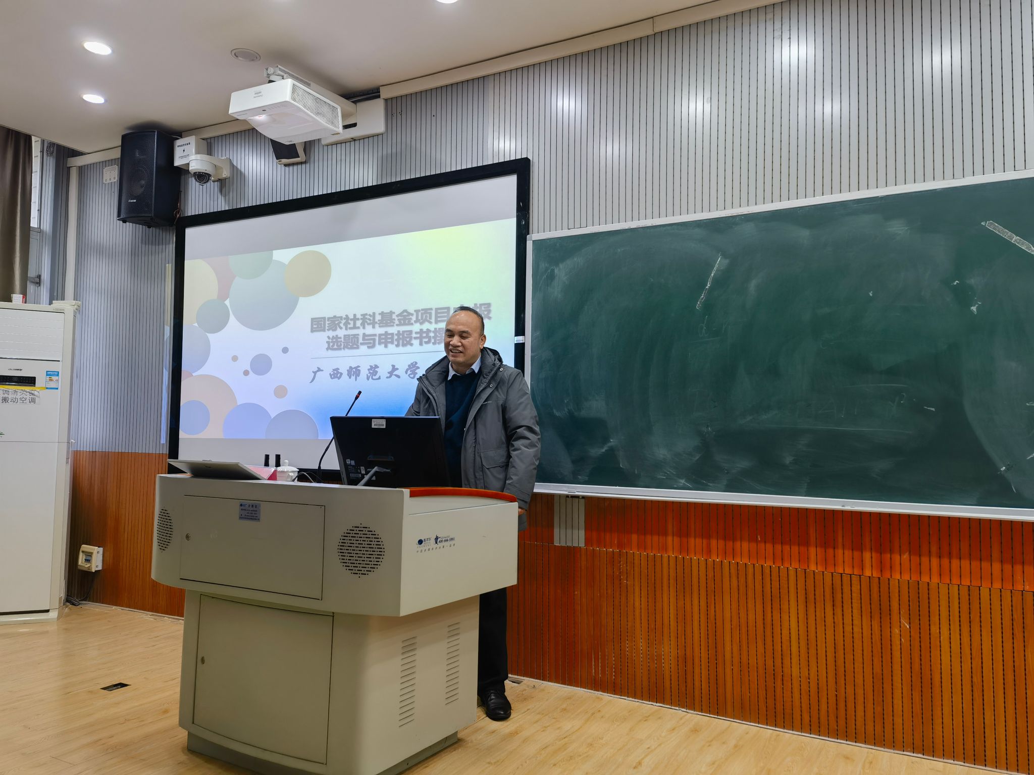 为扎实做好2024年度国家社科基金项目申报工作,提高学院社科项目申报质量和水平,1月22日下午,公司邀请广西师范大学威廉希尔中文官网副经理、博士生导师刘明录教授作“国家社科基金项目选题原则与申报书撰写”的专题讲座。讲座由公司副经理蒙岚教授主持。