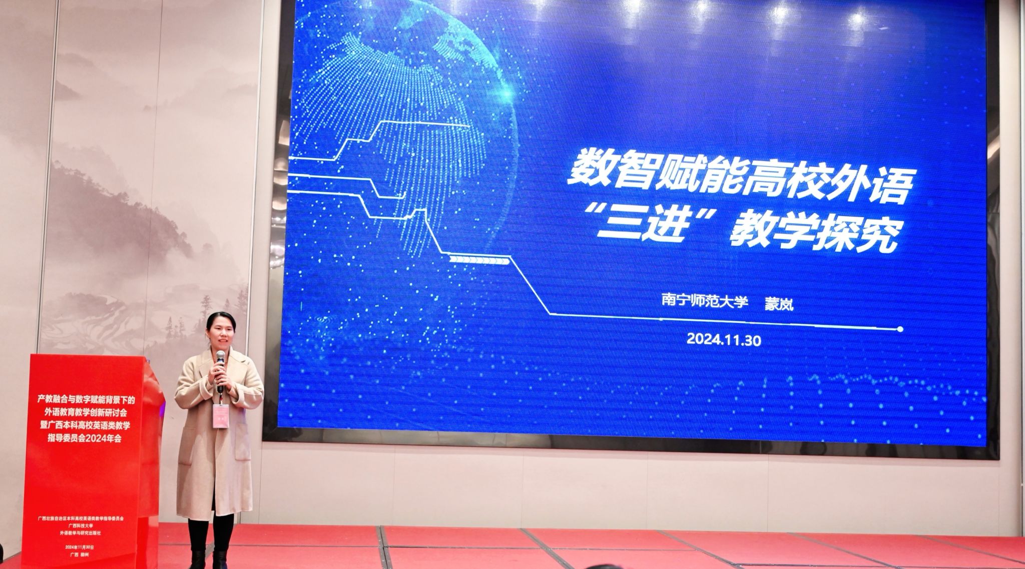 公司蒙岚教授做了题为《数智赋能高校外语“三进”教学探究》的专题报告。深入探讨了如何通过人工智能推动外语“三进”教学创新。报告中提到通过数字化技术将外语课程思政深入到课堂,推动教材的数字化转型,并通过创新教学方法促成员工深度思考和语言输出帮助员工更好地理解和吸收知识,真正实现知识的内化和思维转化。蒙教授指出,数字化教学工具不仅能增强课堂互动、优化教学效果,还为传统外语教学模式带来了深刻变革,有利于助力教师将思政元素融入外语专业课程,实现外语知识传授与价值引领的有机统一,培育员工的国际视野和跨文化沟通能力。