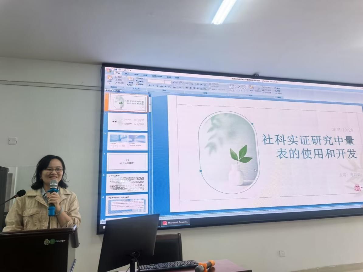 肖西西副教授以《社科实证研究中量表的使用和开发》为题,详细介绍了量表的定义、构成及其与普通问卷的区别。她指出,研究生阶段应优先选用成熟量表,并分享了如何根据理论构念匹配度、语境适用性等标准筛选高质量量表。此外,她还就量表开发的基本流程与质量评估提出了具体建议。