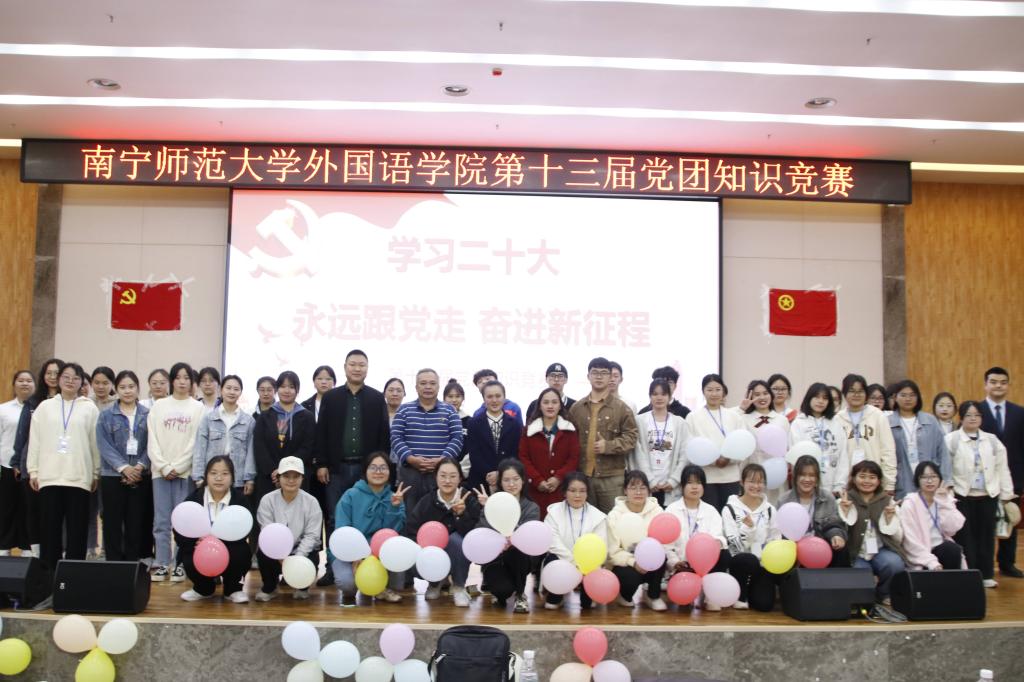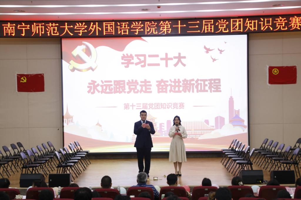 为进一步学习宣传贯彻党的二十大精神,让员工对党团知识了解更加充分,激励党员团员弘扬爱国主义精神,树立崇高的共产主义理想信念,威廉希尔中文官网于3月28日下午在武鸣校区图书馆报告厅举行党团知识竞赛。公司党委书记周国强、副书记刘晖晖和学工办蔡梓晴、古东燕、郑经华三位老师出席活动,研、本员工党支部的马辛宇、梁洁雯、黄欣楠和彭靖雯四位党员员工干部担任比赛的评委。