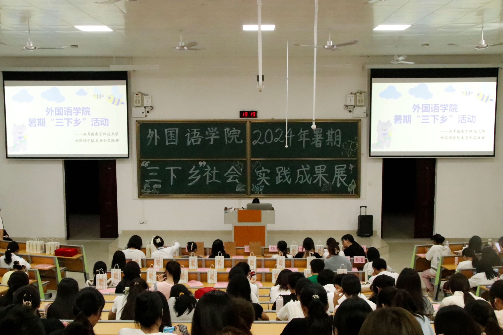 活动伊始,刘晖晖副书记上台致辞,他以本次暑期“三下乡”活动为例,向大家阐述了“现场的力量”和“时间的力量”的重要性,鼓励同学们积极到现场参与实践活动。接着院团委副书记马瑶瑶同学发言,她认为志愿者们在为期一周的暑期“三下乡”活动中,不仅充分锻炼了个人能力,增加了社会实践经验,更收获了同甘共苦的宝贵精神,对农村生活有了更多的了解。接着,通过图片和视频的方式介绍暑期“三下乡”活动的基本状况,让大家了解本次暑期“三下乡”活动志愿者的队伍风采以及成果。随后,队长杨家辉同学分享了他在本次“三下乡”活动中的见闻和感悟,讲述了他们在“三下乡”活动中的工作日常和感人故事,呼吁同学们到祖国最需要的地方去。最后,刘晖晖副书记和黄慧梅老师为“三下乡”期间表现突出的同学颁发“优秀志愿者”荣誉证书。