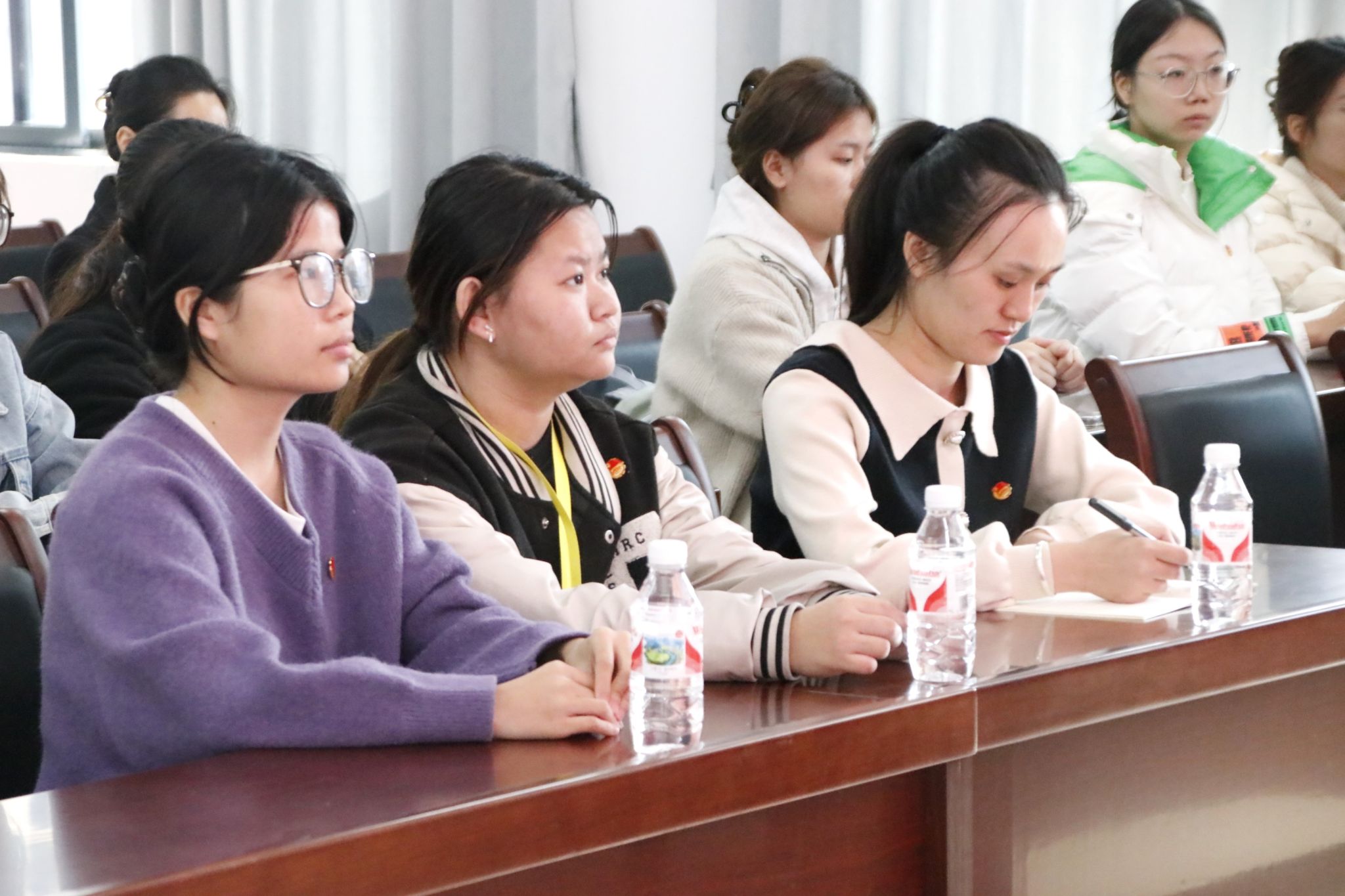 随后,新团员代表吴雨晴上台发言。她强调了共青团员应具备的责任与担当,表示将时刻铭记于心并付诸行动,发挥共青团员的模范带头作用。接着,老团员代表周君燕上台发表感想。她表达了重温入团时的激动与期待之情,对新团员的加入表示鼓励与支持,强调新老团员应牢记誓言,坚守奉献友爱的共青团员精神,承担起共青团员的义务。