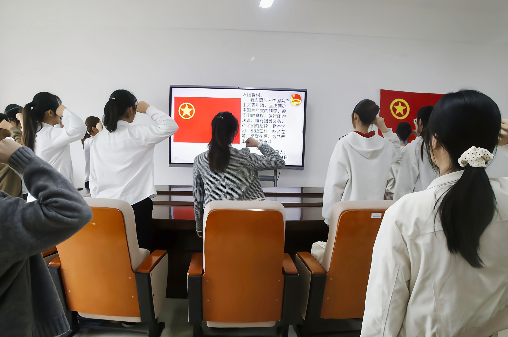 仪式在庄严的国歌声中拉开序幕,主持人宣读新发展团员名单,并向新团员表示热烈祝贺。随后,蔡梓晴老师与在场的优秀党员、团员代表一同为新团员佩戴团徽。在主持人的领誓下,全体新团员面向团旗庄严宣誓,铿锵有力的誓言表达了他们坚定的理想信念与青春担当。