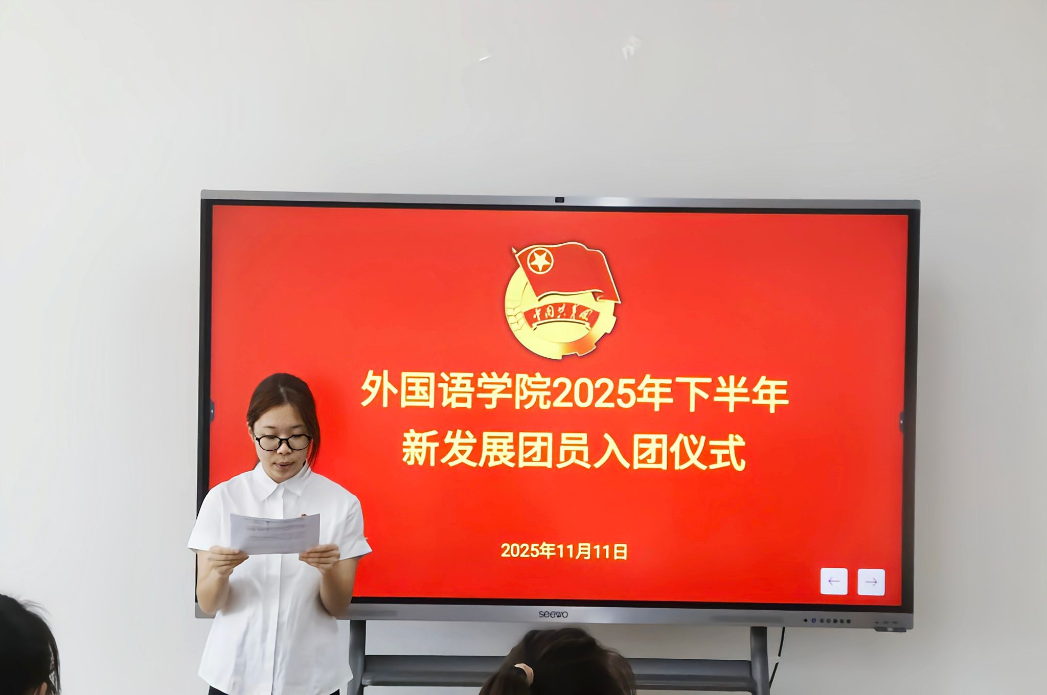 蔡梓晴老师向新团员提出了三点期望:一要筑牢信仰之基,做党的追随者,认真学习党史、团史,将“请党放心,强国有我”融入血脉;二要锤炼专业之能,做融通中外的实干者,夯实听说读写译的基本功,立足专业优势,讲好中国故事;三要担起应尽之责,做服务集体的先行者,发挥带头作用,带动身边同学共同进步。