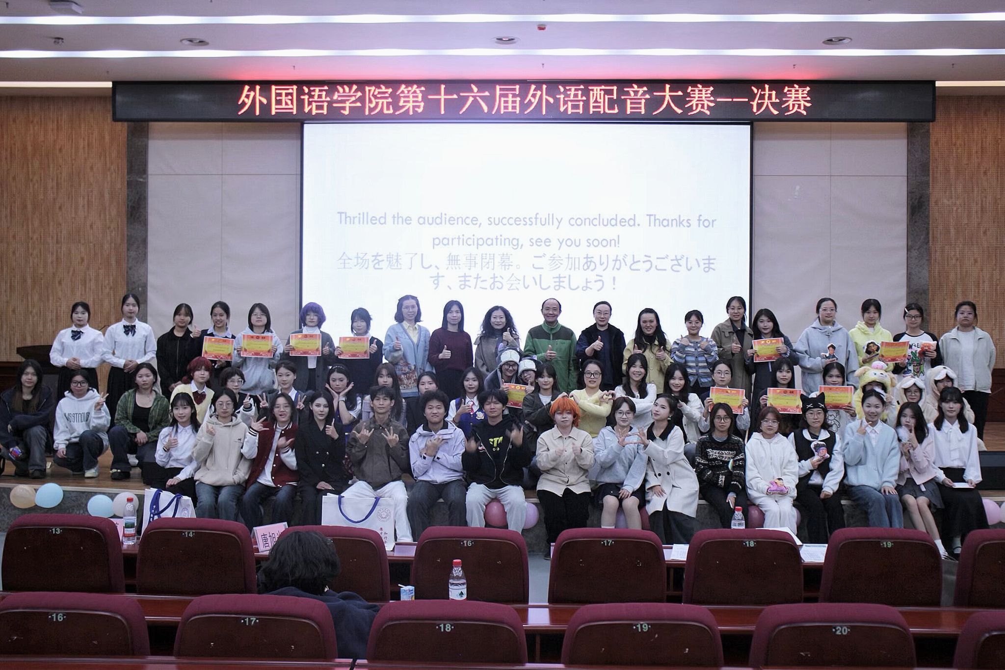 11月11日,初赛在武一教学楼的121教室顺利开展。经过威廉希尔中文官网4名评委(英语、日语各2名)的严格评审,多支优秀队伍脱颖而出晋级决赛。11月25日,决赛在武鸣校区图书馆报告厅隆重举行,公司党委刘晖晖副书记、评委唐旭光、刘婷婷、朱岚晖、林莉丽老师、学工办蔡梓晴、邓梦芸、黄慧梅、黄恬、王倩老师及员工会成员莅临现场指导。决赛中,选手们默契配合,精准把握角色语气与情感,中英、中日双语字幕的呈现让现场观众沉浸式感受语言与艺术的融合之美,精彩表现赢得阵阵掌声。