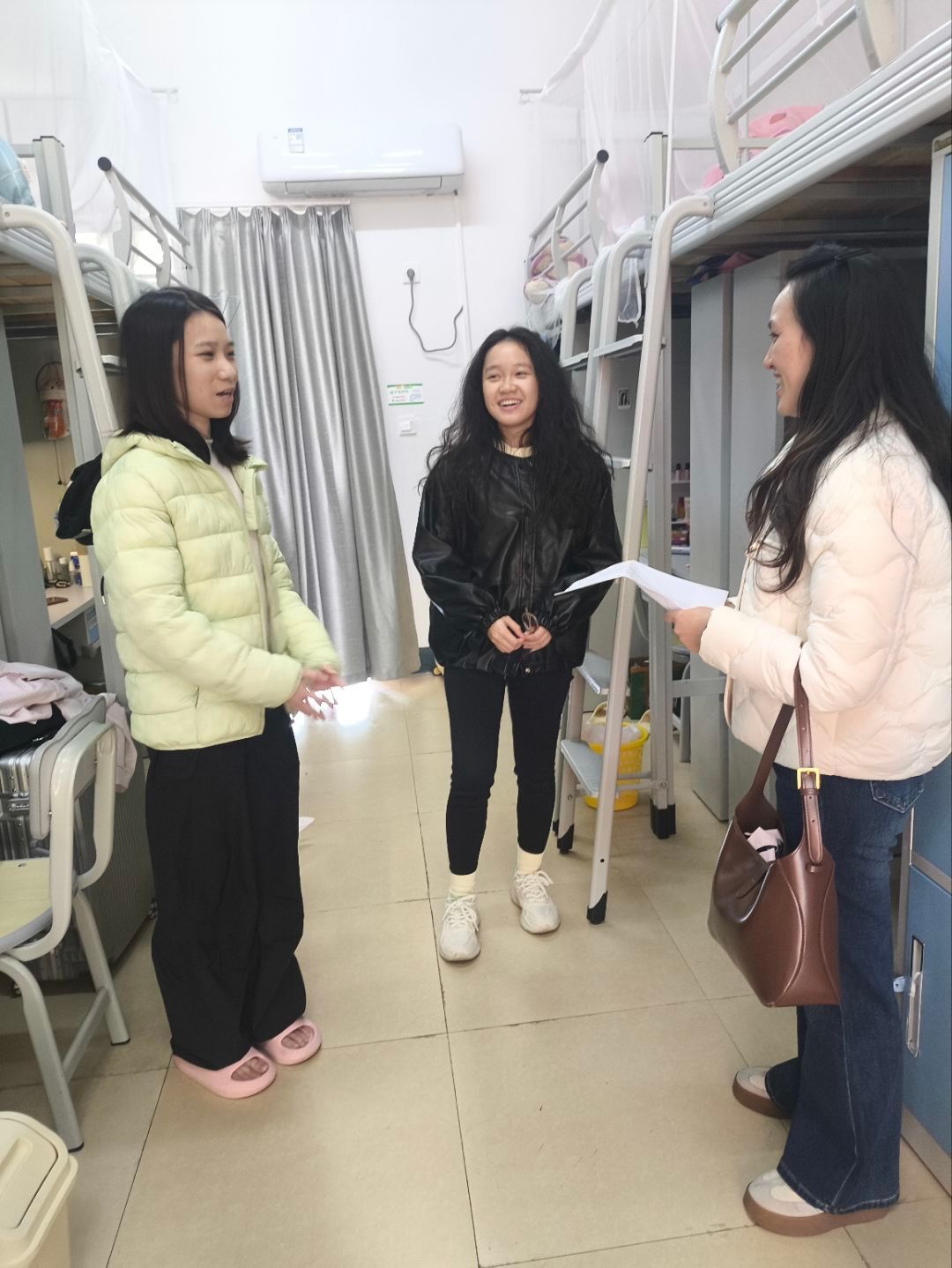 此次走访聚焦宿舍安全与卫生两大核心,重点排查大功率电器、私拉乱接电线、违规使用明火等安全隐患,同时检查宿舍内务整理、卫生清洁、物品摆放及垃圾分类等情况。走访中,领导、辅导员与员工“拉家常”,问学业、聊就业,亲切细心询问大家的近况,提醒大家增强防火、防盗、防触电意识,各宿舍做到人走断电、门窗上锁,贵重物品妥善保管,确保宿舍安全。