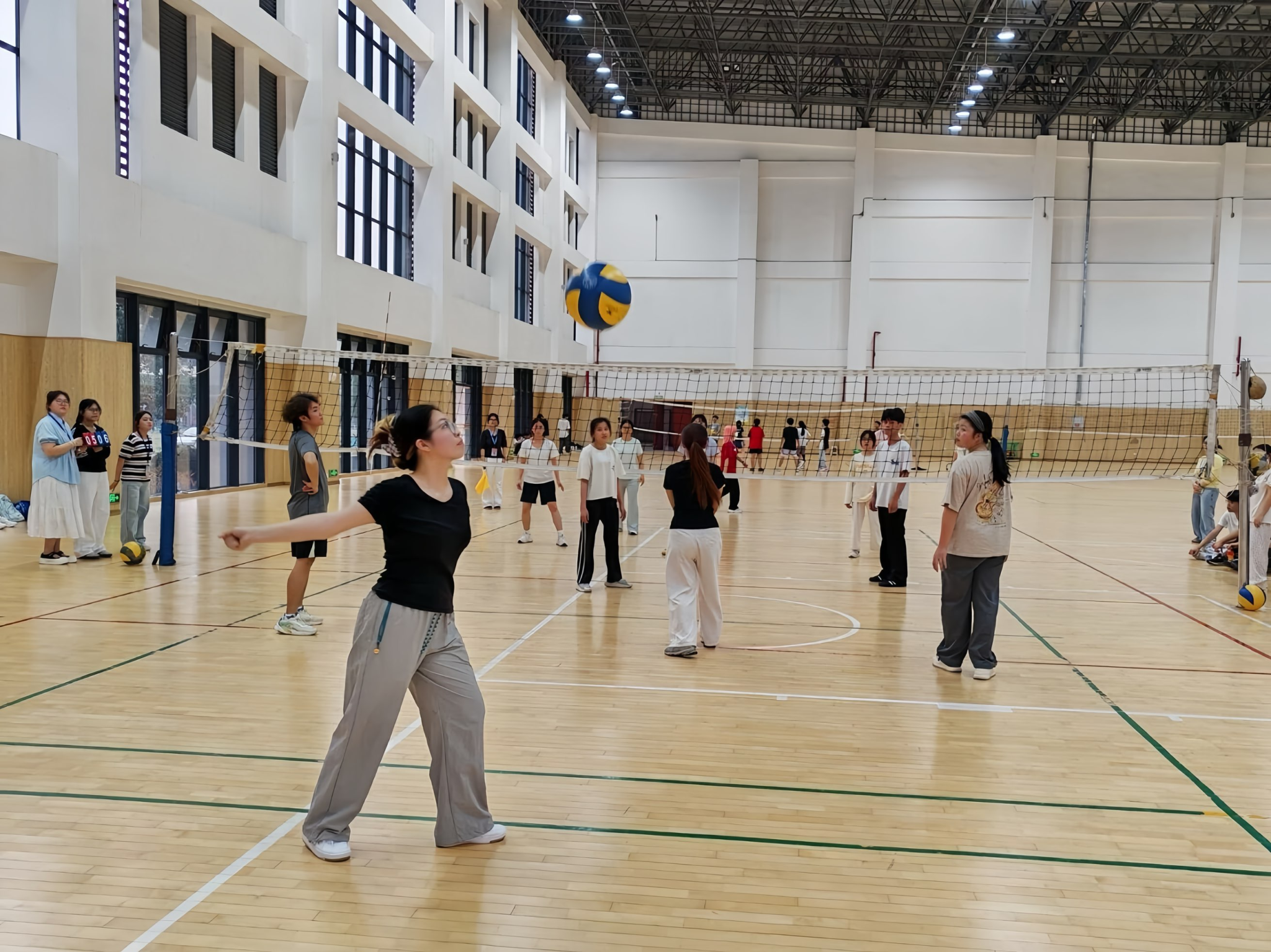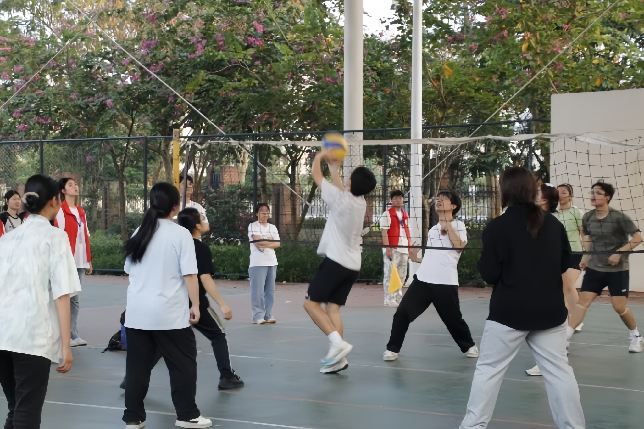首场比赛开始后,双方队员迅速进入状态。发球、接球、传球、扣球、拦网,各环节衔接流畅,配合默契,场上比分交替上升;场边观赛同学的呐喊助威声,也为赛场注入了满满的活力。相邻场地的比赛也同步进行,哨声、击球声与脚步声交织在一起,整个球场洋溢着紧张有序又热烈昂扬的竞技氛围。
