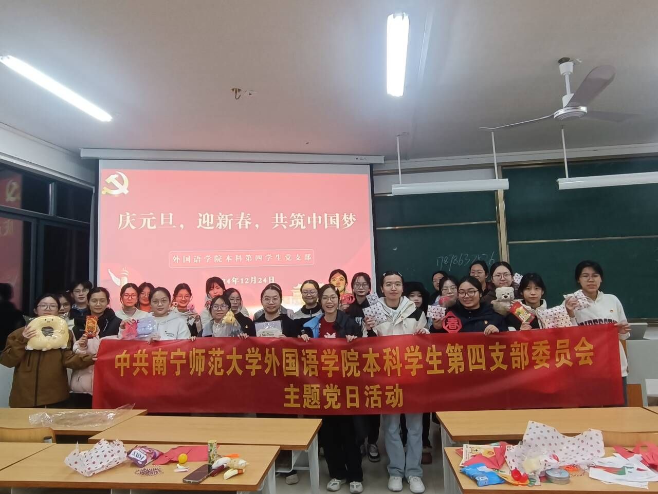 随着岁末年初的脚步日益临近,为了营造浓厚的节日氛围,激发广大党员同学的爱国情怀和民族自豪感,2024年12月24日晚,本科第四员工党支部在实验楼2C-301教室举办“庆元旦,迎新春,共筑中国梦”主题党日活动。