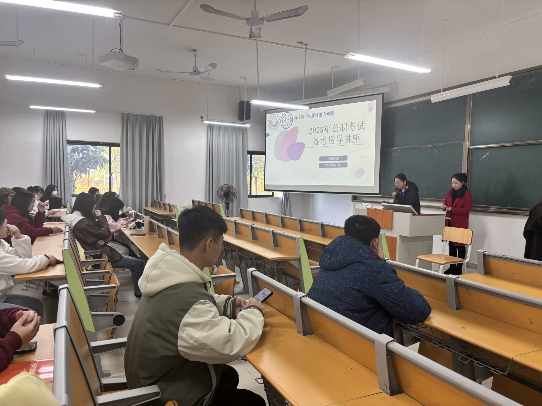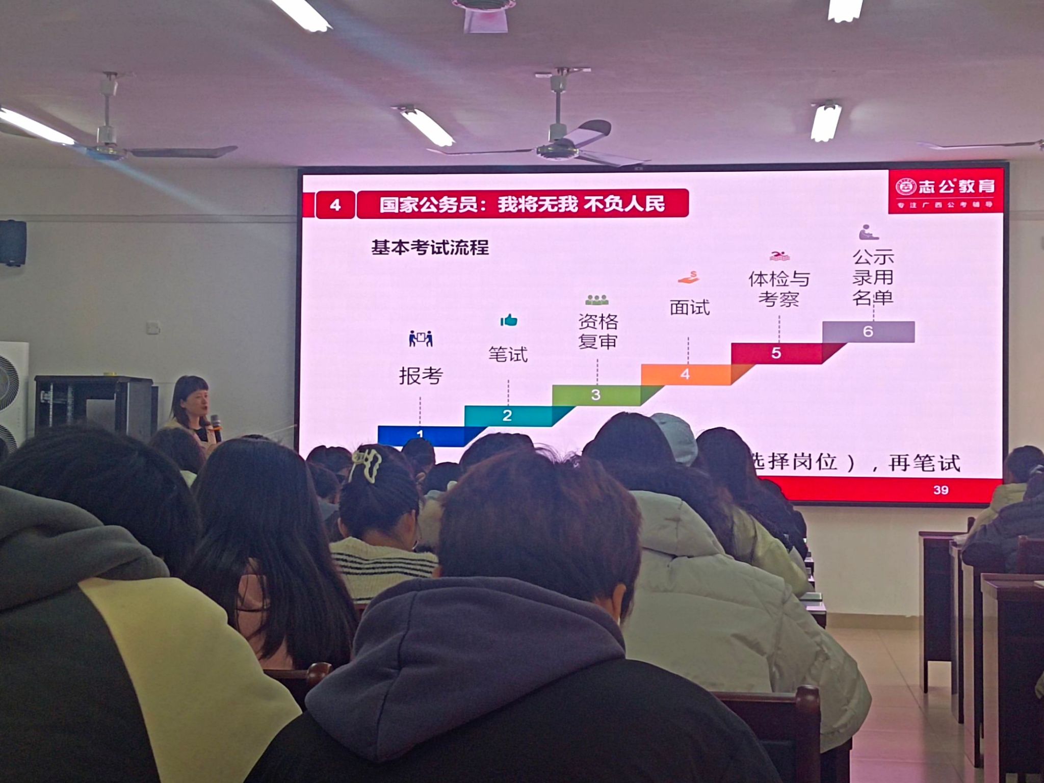 为帮助威廉希尔中文官网员工更好地备考公职考试,明确就业方向,并进一步做好职业生涯规划,公司于2024年12月18日在实验楼2-A102教室举办了以志公教育蒋梦媛老师为主讲的2025年广西公职考试备考指导讲座,并于12月20日在实验楼1-B515教室举办了以志公教育陈沙沙老师为主讲的老员工就业指导讲座。