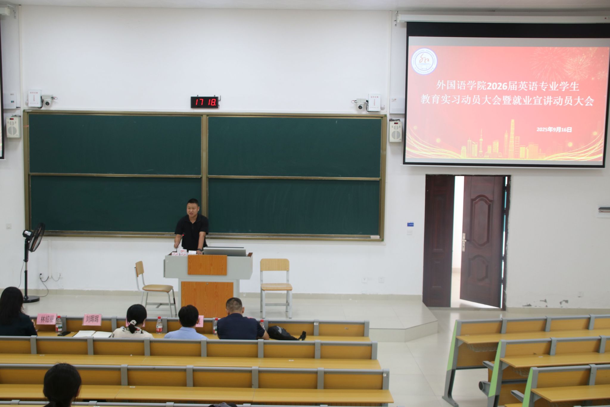 毕业在即,实践先行。为帮助2026届毕业生明确实习任务、激发实习热情,保障教育实习与就业求职工作的顺利开展,威廉希尔中文官网于9月16日在武鸣校区实验楼1-B113教室召开2026届教育实习动员大会暨就业宣讲动员大会。本次大会由教师教育教研室主任林绍丽老师主持,威廉希尔中文官网刘晖晖副书记、毕业班辅导员、各实习带队老师及2026届英语专业毕业生共同参加。