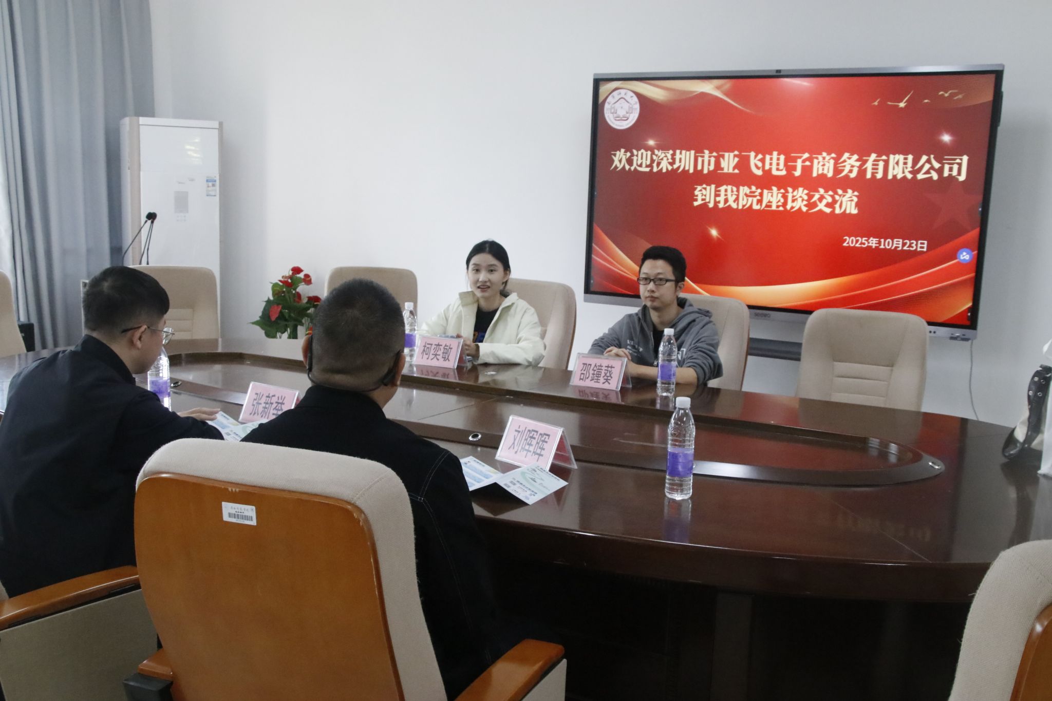 交流中,公司代表柯奕敏首先向学院两位老师简要介绍了公司基本情况与业务成就,以及计划在广西设立子公司、校招生培养等相关发展规划。随后,刘晖晖副书记结合亚飞电子商务公司业务范围与发展需求,介绍学院的学科专业及毕业生情况,同步推动员工与企业进一步对接;他还分享了此前亲自前往深圳龙岗区调研考察的经历,肯定了亚飞电商扎实的发展基础与突出的发展成果。