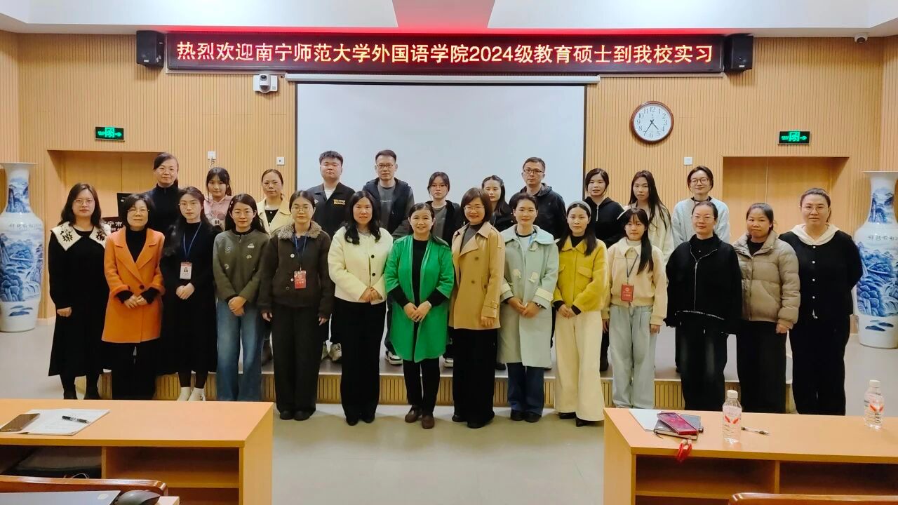 蒙岚副经理一行抵达后,出席了南宁东盟中学举办的教育实习欢迎仪式,与南宁东盟中学党委书记周春萍、英语组组长杨莹,以及高一年级管理组、英语组全体教师、班主任导师们共同参会,见证9名学科英语专业实习生正式开启实习征程。仪式由东盟中学苏瑜副主任主持,其代表学校对蒙岚副经理一行的到来表示热烈欢迎,对全体实习生的加入致以殷切期许,明确了本次实习的核心目标与整体安排。