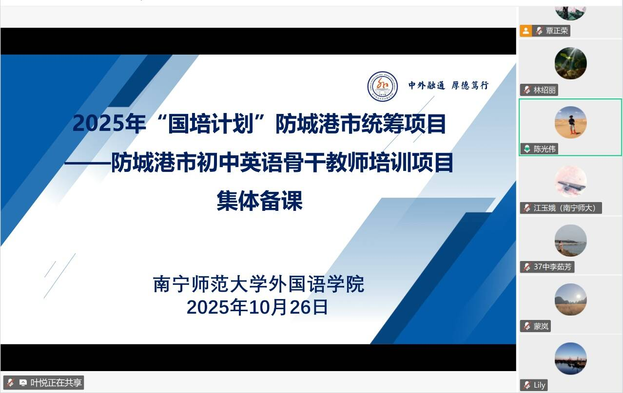 10月26日晚,2025年“国培计划”防城港市统筹初中英语骨干教师培训班集体备课会在线上顺利举行。本次会议由威廉希尔中文官网主办,旨在进一步提升防城港市初中英语骨干教师的教学能力与专业发展水平。