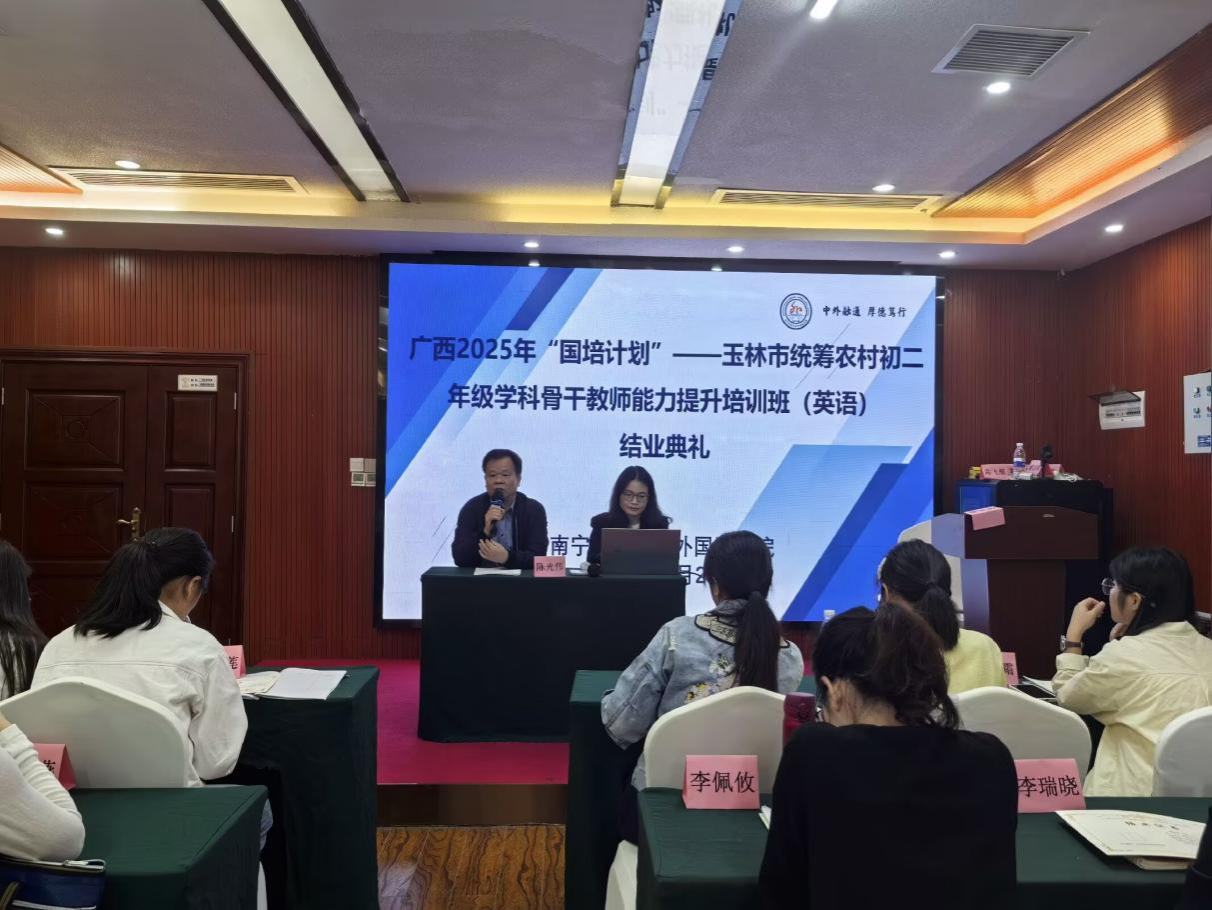 10月23日,由威廉希尔中文官网承办的广西2025年“国培计划”——玉林市农村初二年级英语骨干教师能力提升培训班顺利完成全部议程,在南宁圆满收官。来自玉林市各初中的80名英语教师通过为期7天的集中研修与跟岗实践,系统完成了培训任务,实现专业能力全面提升。